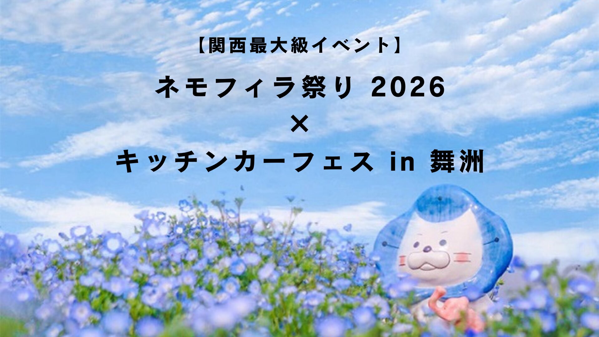 青い絨毯のようなネモフィラが咲き誇る絶景スポット、大阪まいしまシーサイドパークにて開催される「ネモフィラ祭り 2026」の併催イベントとして、キッチンカーフェスの出店者を募集します! 📣出店枠は【限定12区画】この案件はわずか12区画の限定募集です!